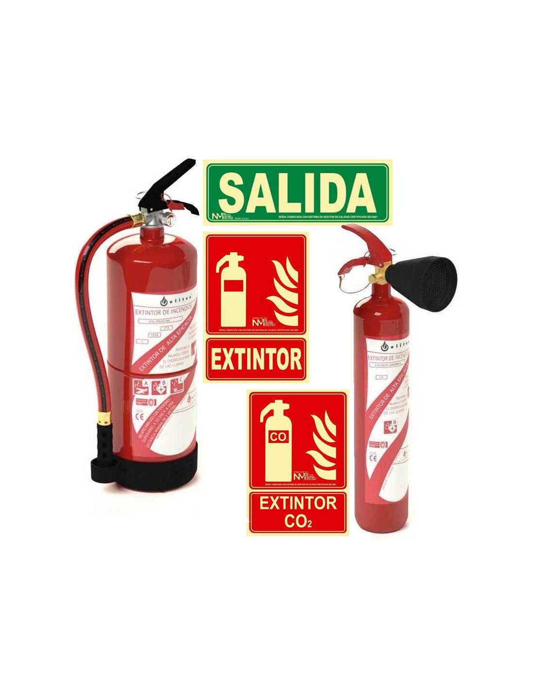 Completo kit de extintores y se帽ales fotoluminiscentes dise帽ado para comercios, locales y empresas. Incluye un extintor de 6 kg de polvo ABC, un extintor de CO2 de 2 kg para equipos el茅ctricos, dos se帽ales fotoluminiscentes de extintor y una se帽al de salida. Todos los productos cuentan con certificaci贸n oficial y est谩n homologados seg煤n normativa vigente.