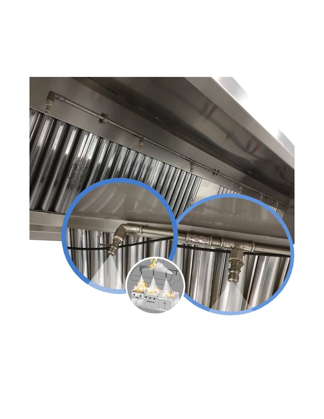 El sistema PROTEX-300 requiere una instalación profesional que respete la normativa UNE 23510:2017. Las boquillas deben ubicarse estratégicamente para cubrir zonas de cocción, filtros y conductos de extracción. Para cada 3 metros de conducto horizontal se instala una boquilla, garantizando una protección eficiente. En áreas de cocción, las boquillas deben cubrir superficies máximas de 0,5 m². En caso de superficies mayores, será necesario añadir boquillas adicionales.