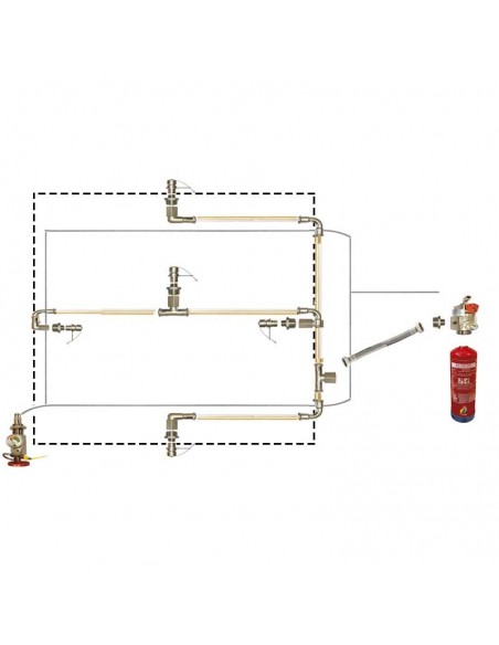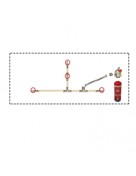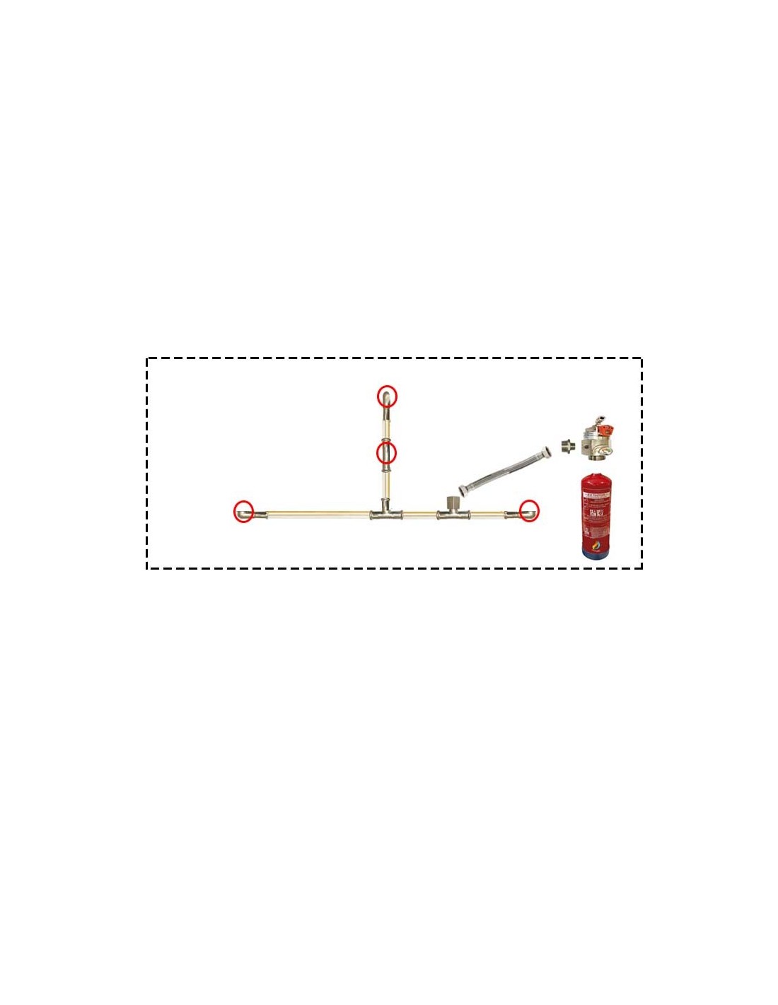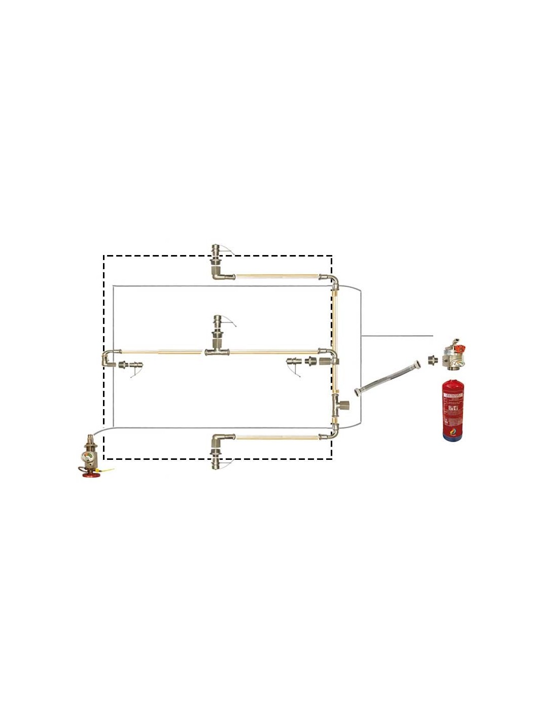 El kit incluye todos los elementos necesarios para su instalación rápida y efectiva en campanas extractoras centrales. Entre los componentes destacan el extintor de 9L, la válvula de disparo rápido, el tubo térmico y las boquillas difusoras, junto con todo el material necesario para una instalación segura. Además, cuenta con la certificación conforme a la normativa de extinción automática vigente.
