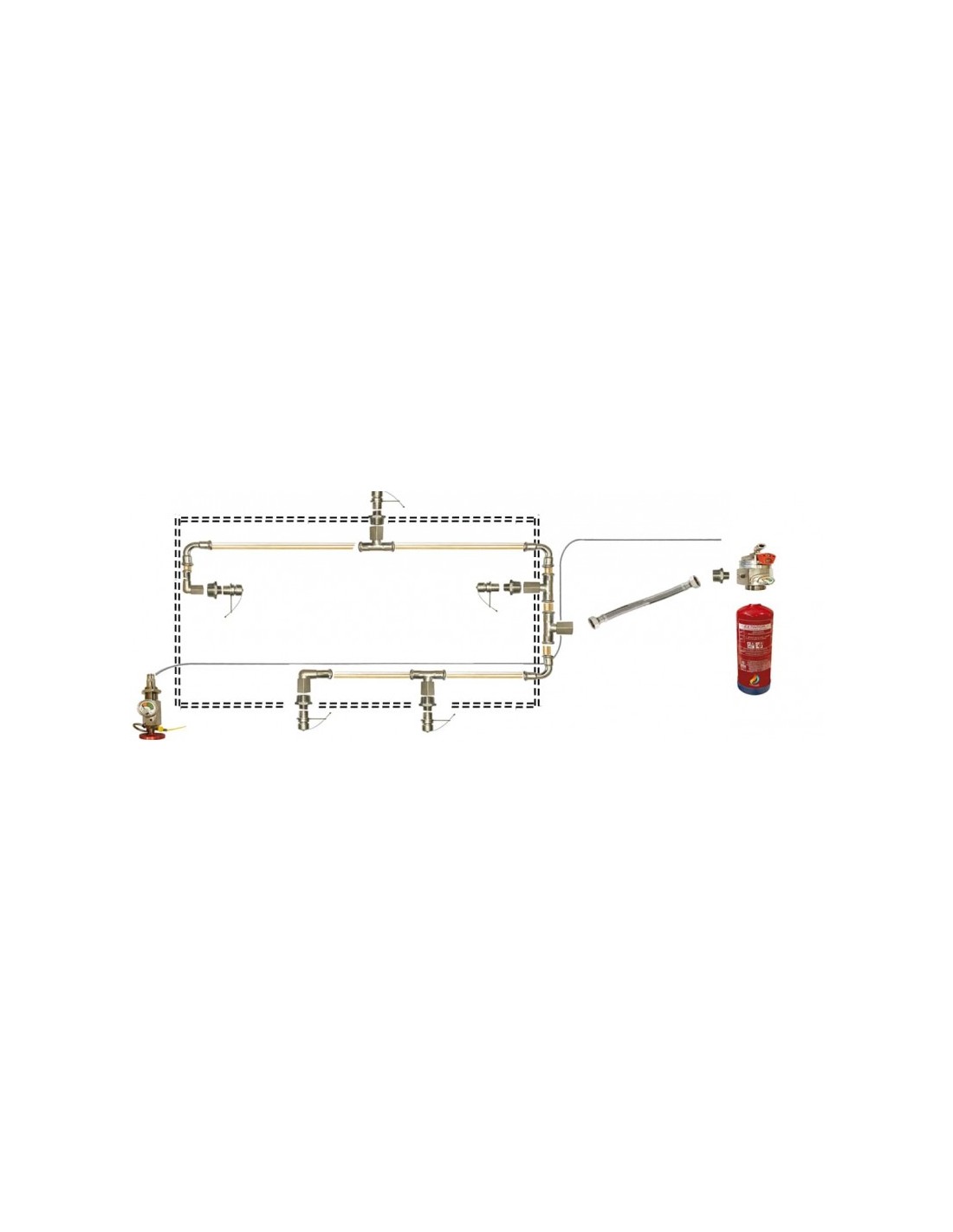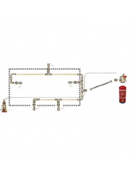 Este sistema de extinción incluye todos los accesorios necesarios para su instalación en campanas de cocina murales. Su diseño garantiza la detección eficiente de incendios y una extinción rápida.